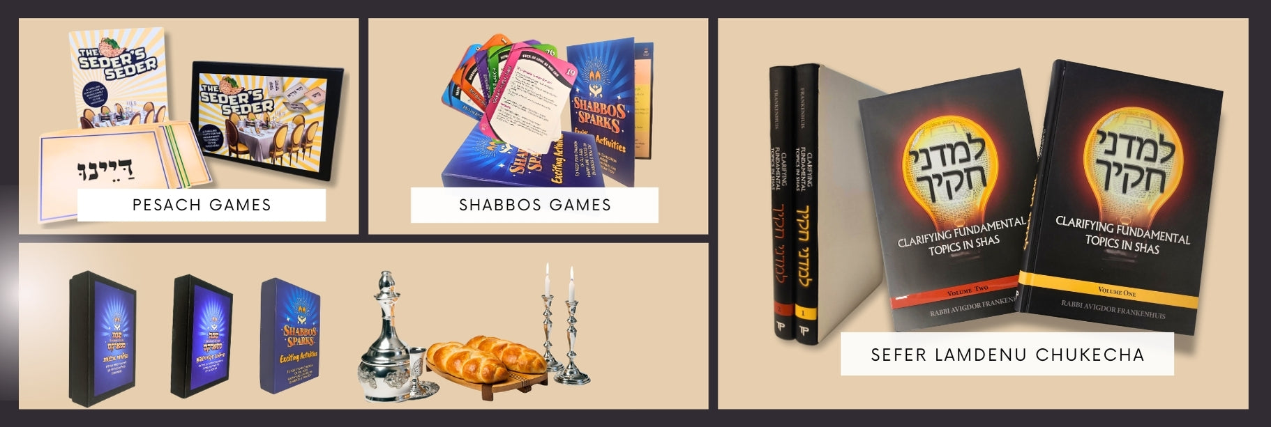 Rabbi Frankenhuis foresaw the need for quality Shabbos and Yom Tov entertainment and developed the Sparks Series games suitable for all ages, guaranteeing hours of fun and excitement. He developed the range for English, Hebrew, and Yiddish speakers. A special Pesach edition is due out soon.